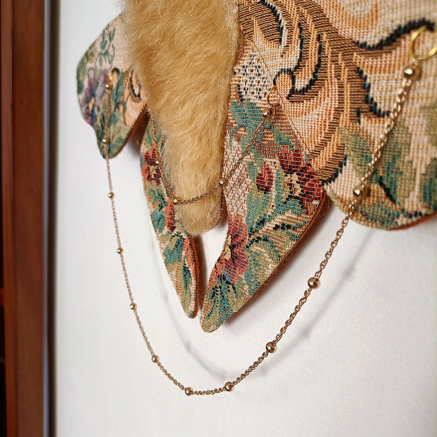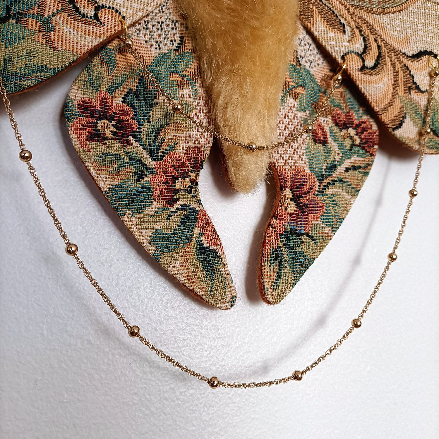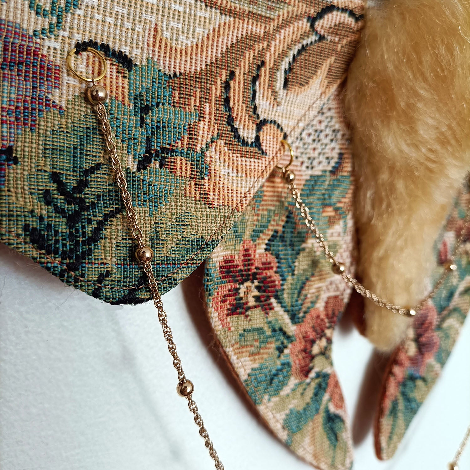 Her wings have been made using a stunning vintage 80s woven tapestry fabric with a detailed floral pattern, and she is decorated with a delicate up-cycled gold tone chain.