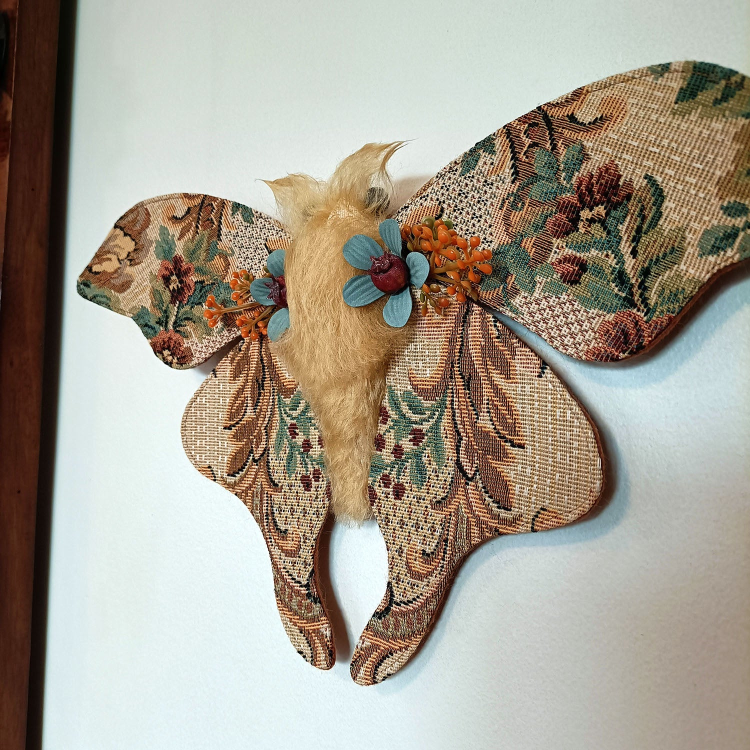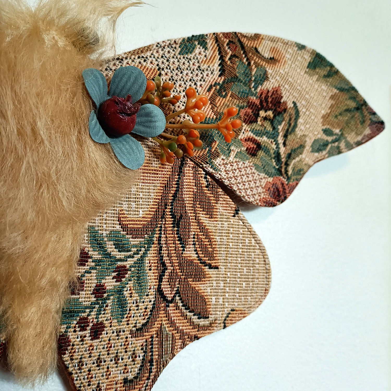 Her wings have been made using a stunning vintage 80s woven tapestry fabric with a detailed floral pattern, and her artificial flower details have been upcycled from an 80s hair accessory! Her eyes are faceted black glass beads.