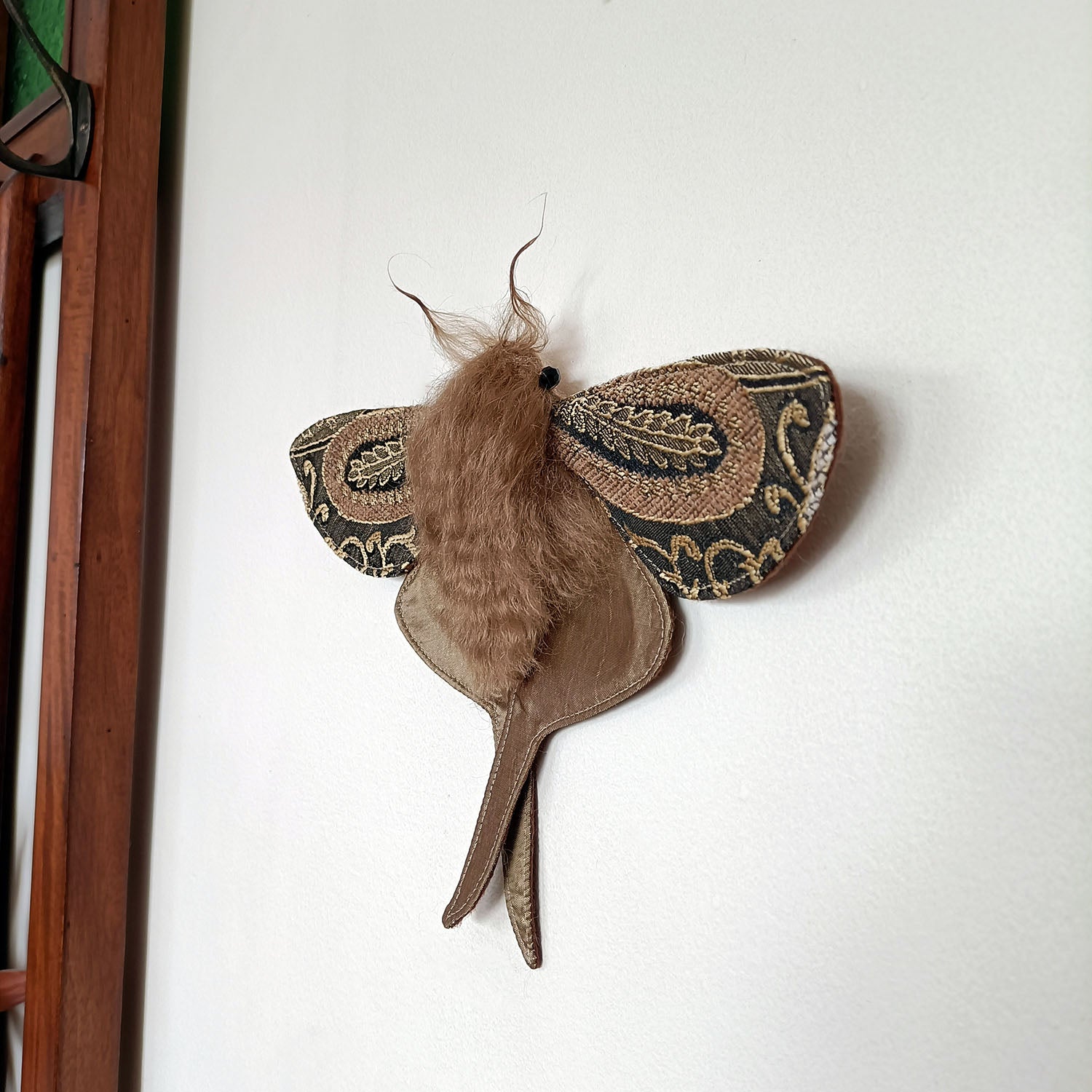 His wings have been made out of a stunning vintage upholstery fabric. His eyes are faceted black glass beads.