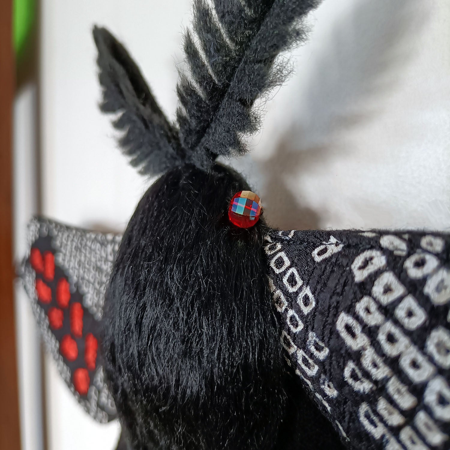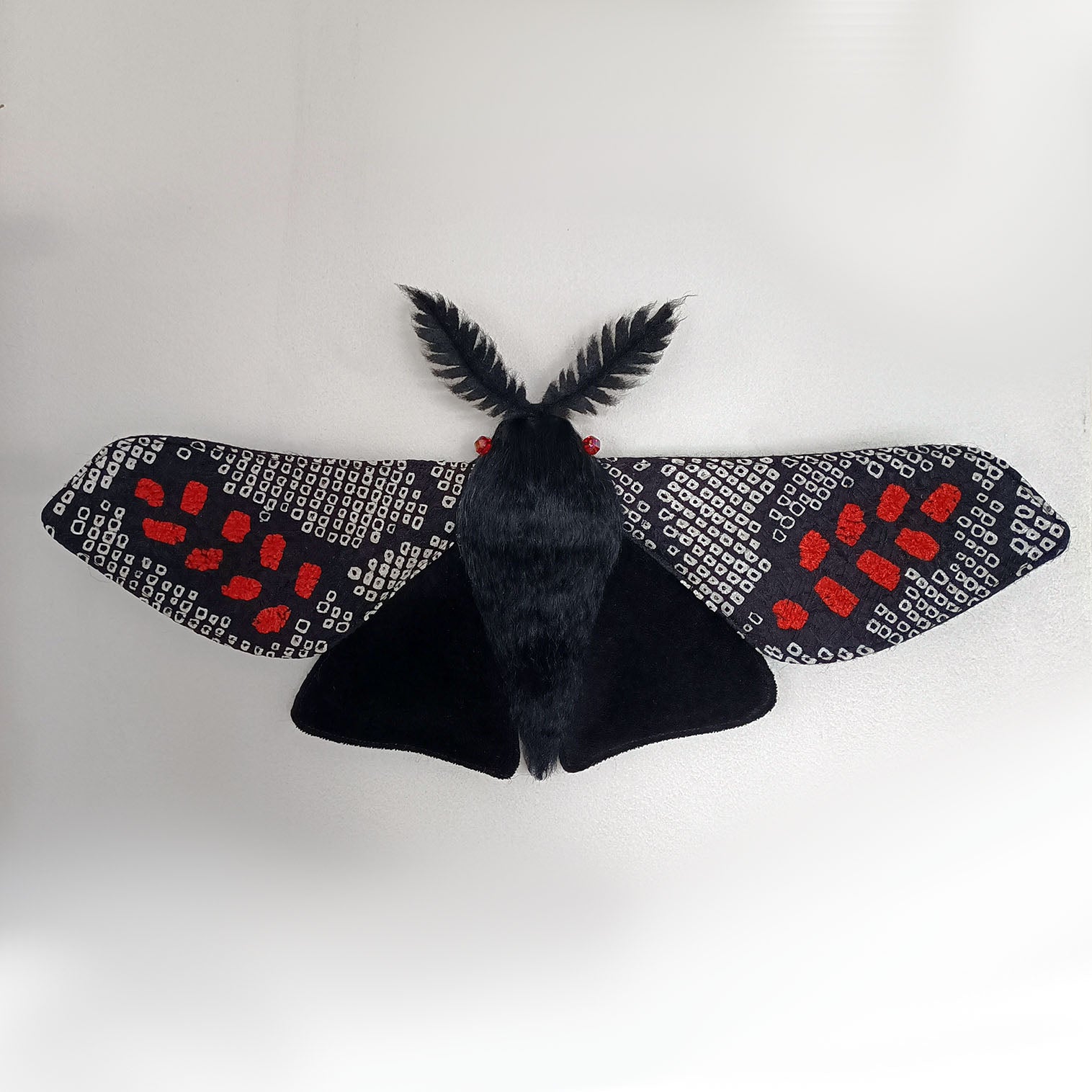 At an imposing 41cm (or 16in) wide, this Mothman-inspired decoration's wings have been made out of a Shibori hand-dyed 100% Silk, taken from a damaged 1970s vintage Haori jacket.